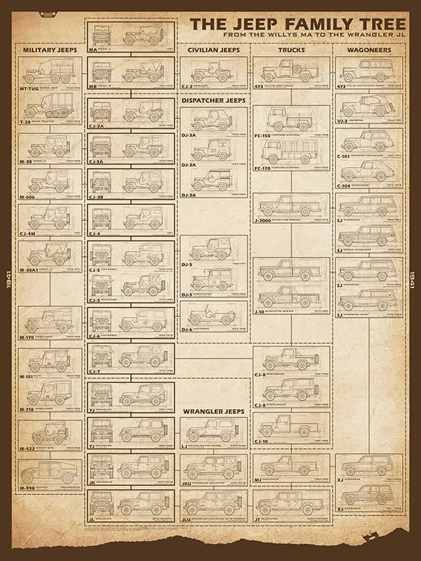 The posters come in various layouts. The most popular is the Evolution series, which traces the lineage of a brand or vehicle through 8 different models. Below is the Jeep Family layout, which shows a genealogy of the jeep throughout the history of the brand.